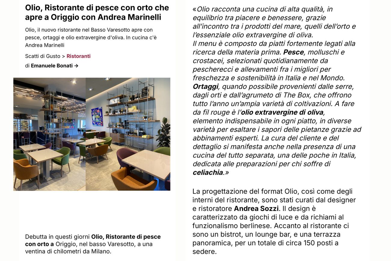 La progettazione del format Olio, così come degli interni del ristorante, sono stati curati dal designer e ristoratore Andrea Sozzi. Il design è caratterizzato da giochi di luce e da richiami al funzionalismo berlinese. Accanto al .ristorante ci sono un bistrot, un lounge bar, e una terrazza panoramica, per un totale di circa 150 posti a sedere